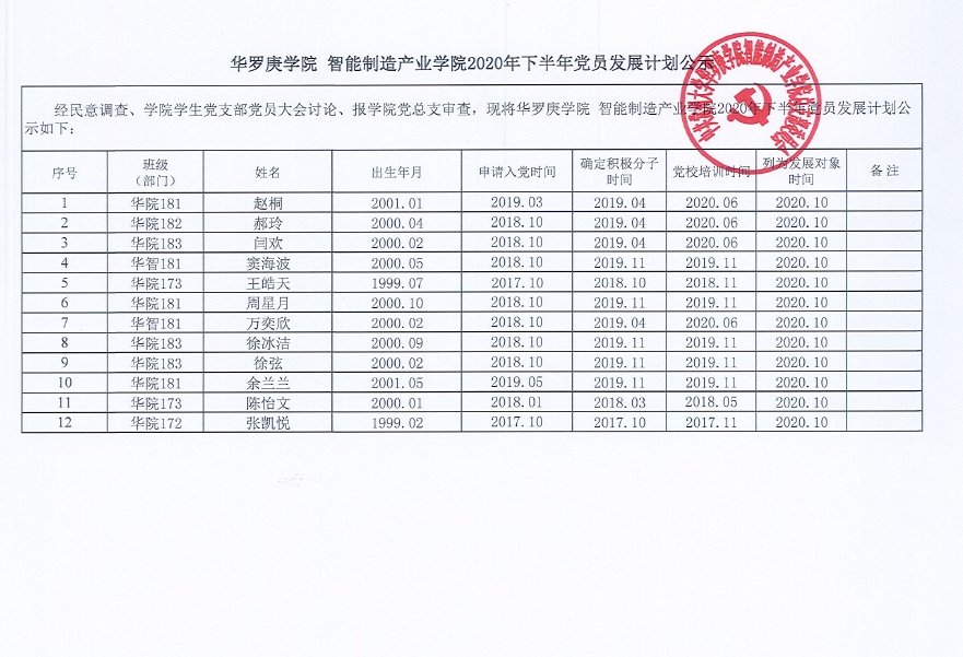 85po 智能制造产业学院2020年下半年党员发展计划公示