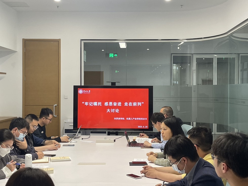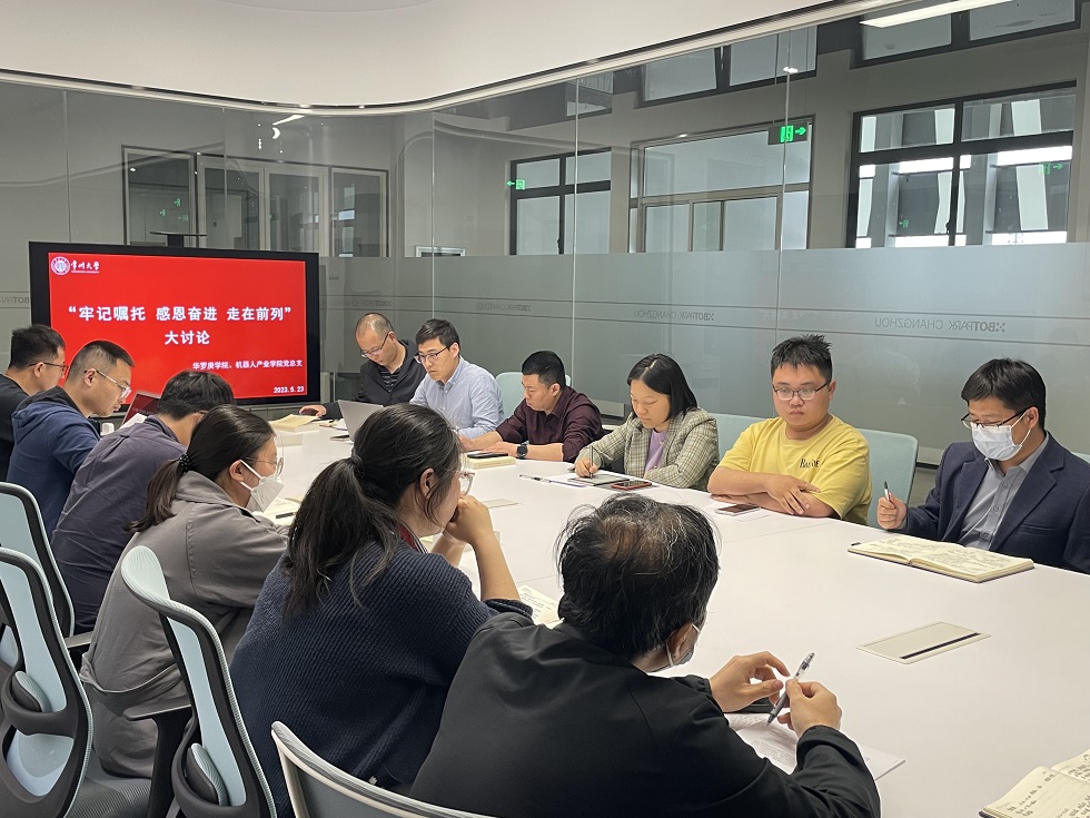 5月22日下午,85po 、机器人产业学院党总支开展“牢记嘱托、感恩奋进、走在前列”大讨论,深入学习贯彻习近平新时代中国特色社会主义思想,总结交流前一阶段学习和调研成果,努力以学铸魂、以学增智、以学正风、以学促干。会议由学院党总支书记宣慧主持,全体教师党员和部分学生党员代表参加讨论。