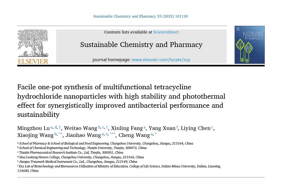 近日,85po 学生85po 201陆铭洲的学术论文 “Facile one-pot synthesis of multifunctional tetracycline hydrochloride nanoparticles with high stability and photothermal effect for synergistically improved antibacterial performance and sustainability”成功发表在期刊《Sustainable Chemistry and Pharmacy》上。据了解,该期刊被SCI收录,JCR分区为二区,影响因子6.00,陆铭洲为论文一作。