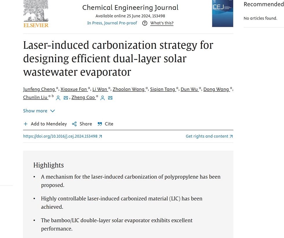 近日,85po 221万力同学作为课题主要参与者,其研究论文“Laser-induced carbonization strategy for designing efficient dual-layer solar wastewater evaporator”在期刊《Chemical Engineering Journal》成功发表。此期刊作为SCI一区顶刊,影响因子15.1。