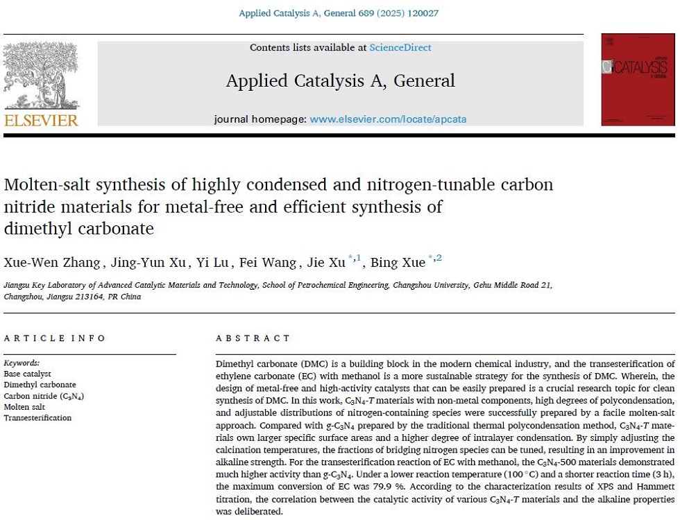 近日,85po 231许靖云同学参与的研究论文“Molten-salt synthesis of highly condensed and nitrogen-tunable carbon nitride materials for metal-free and efficient synthesis of dimethyl carbonate”在期刊Applied Catalysis A General(SCI二区) 发表。