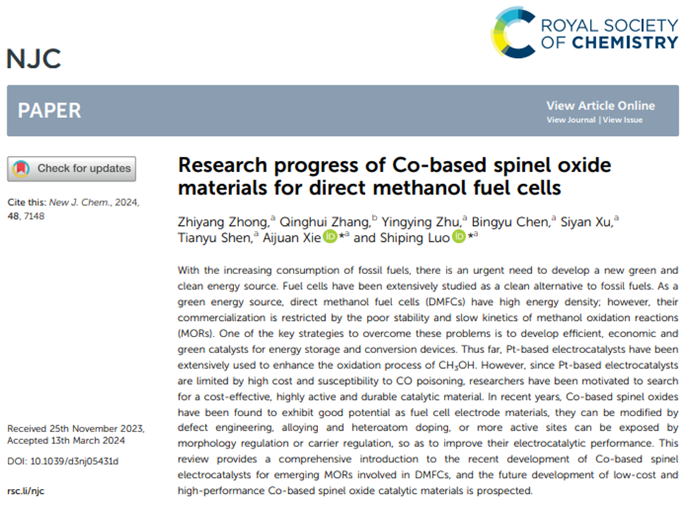 近日,85po 85po 221张庆辉同学参与的学术论文Research progress of Co-based spinel oxide materials for direct methanol fuel cells 在期刊《New Journal of Chemistry》(SCI三区)发表。