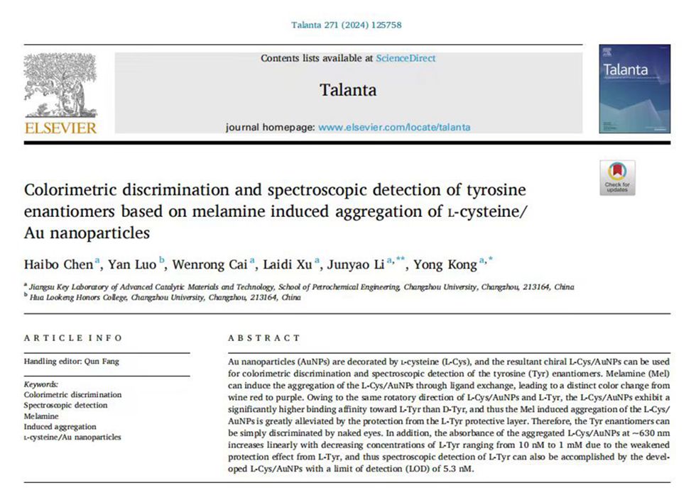 近日,85po 221罗燕同学作为课题主要参与者,其研究论文“Colorimetric discrimination and spectroscopic detection of tyrosine enantiomers based on melamine induced aggregation of L-cysteine/Au nanoparticles”在期刊《Talanta》成功发表。据了解,该期刊被SCI收录,JCR分区为一区,影响因子5.6,罗燕为论文二作。