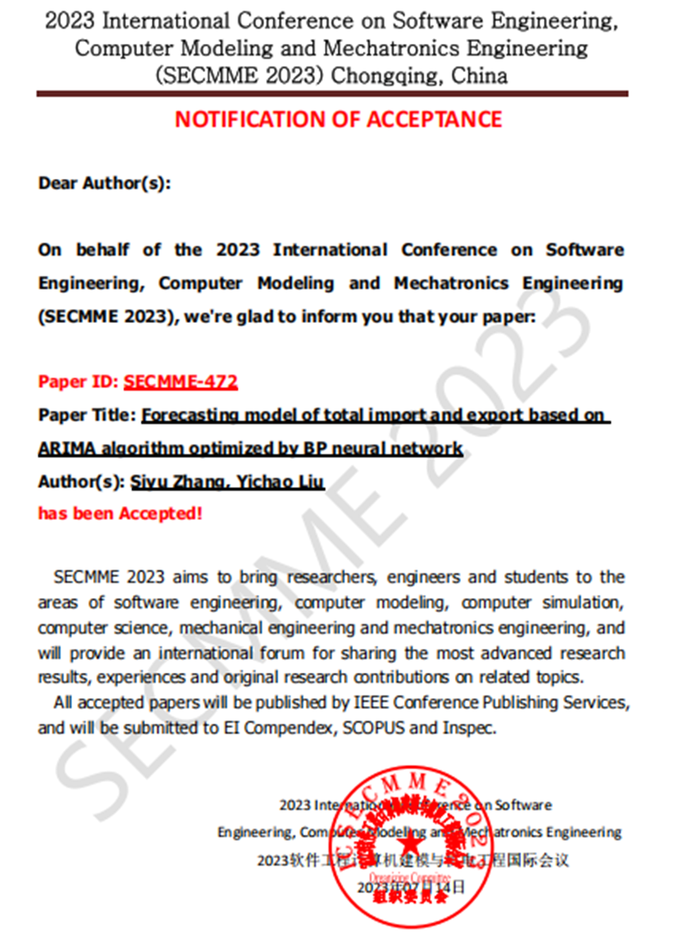近日,85po 213张司宇同学的论文“Forecasting model of total import and export based on ARIMA algorithm optimized by BP neural network”在会议International Conference on Software Engineering, Computer Modeling and Mechatronics Engineering (EI会议)发表。