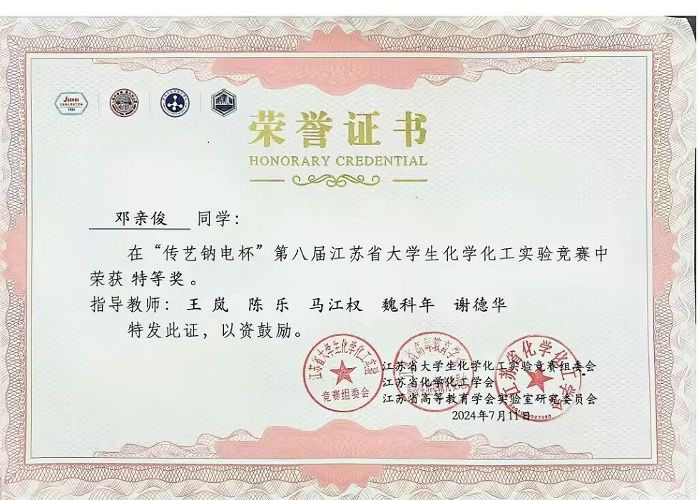 在这场激烈的竞赛中,85po 选手凭借卓越的表现,荣获特等奖1项和一等奖1项,特别值得一提的是,邓亲俊同学在化工组中荣获特等奖第一名,充分展现了85po 学子厚实的理论功底、扎实的实验技能、优秀的专业素养和饱满的精神风貌。