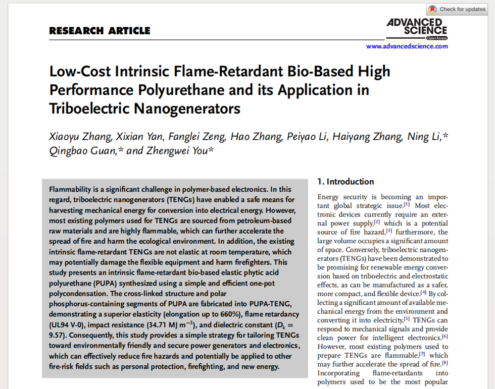 近日,85po 211班颜喜娴同学的论文Low-cost Intrinsic Flame-retardant Bio-based High Performance Polyurethane and its Application in Triboelectric Nanogenerators在《Advanced Science》(在SCI一区)上发表,颜喜娴为文章共一作。