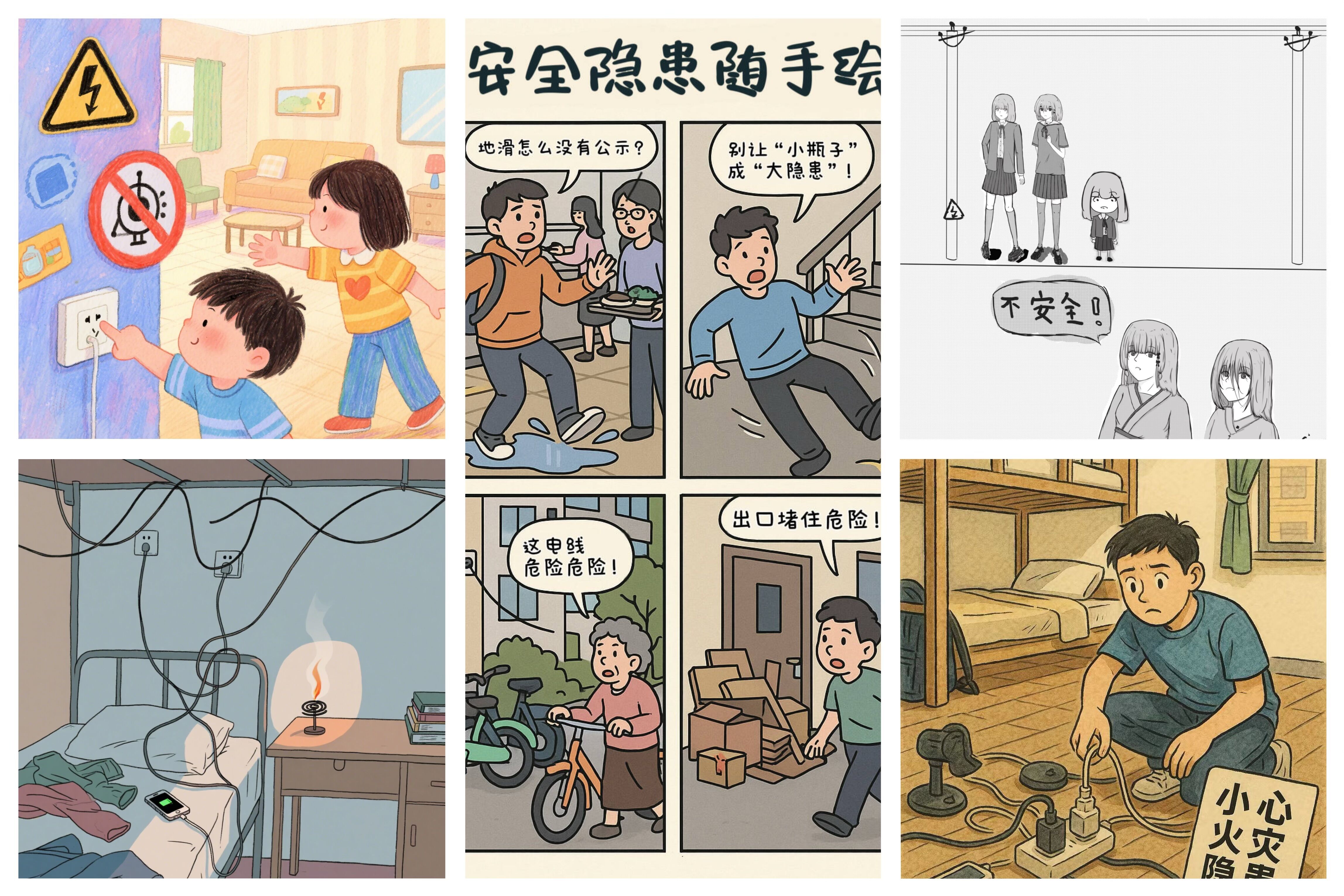 本次活动重点围绕三个方面展开:一是强化理论学习,通过组织师生专题学习习近平总书记关于安全生产的重要论述、集中观看警示教育片等方式,切实提升全员安全意识;二是创新活动形式,开展安全隐患随手拍/绘创意征集,收到学生提交的用电安全、消防隐患等主题作品24件;三是深化隐患排查,对宿舍、教室等重点区域开展安全自查与巡查,针对插线板混乱等问题开展整改“回头看”。