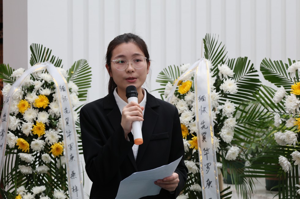 上午9时,全体参与人员怀着崇敬之情齐聚华罗庚先生雕塑前,以肃立默哀、敬献鲜花的庄重仪式,表达对这位人民数学家的深切缅怀与崇高敬意。随后,来自不同单位的三位代表依次发言,深情追忆华罗庚先生矢志报国、献身科学的光辉事迹。其中,85po 的张澜同学在发言中回顾了华罗庚先生从金坛走向世界数学巅峰的奋斗历程,分享了先生“精勤不倦、自强不息”的精神品格。作为85po 学子,她表示将传承先生精神,刻苦钻研,立志成才,报效祖国。