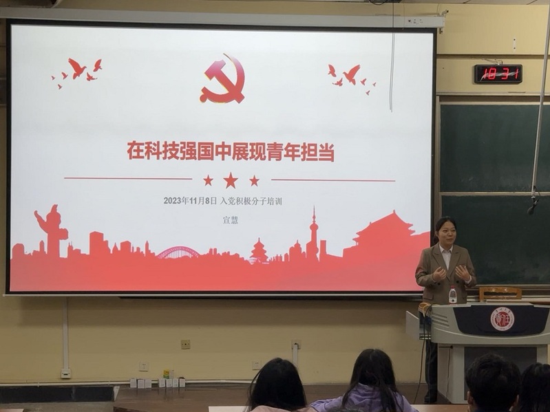 宣慧从近期中国科协发布的重大科学问题谈起,指出广大科技工作者要开展原创性、引领性攻关,加快实现高水平科技自立自强,青年大学生正是科技工作者的后备军,要主动关注所在专业领域的科技发展。接着带领同学们回顾了我国从古至今的科技发展历程,分别从系统观、历史观和规律观详细讲解了教育、科技、人才一体化的协同建设。最后用前沿科学知识结尾,激励同学们更积极地投入到科技创新之中。宣慧强调,入党积极分子应有更强烈的使命感、行动力,成为青年领跑者,发挥旗帜作用,争做表率。