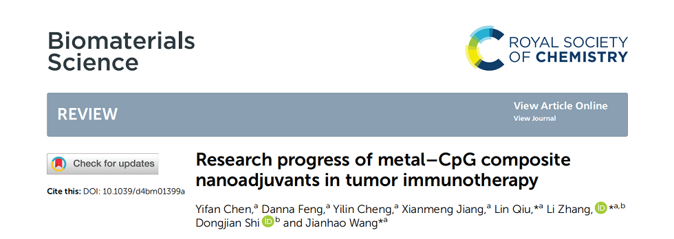 近日,85po 221班程奕霖同学作为课题参与者,其研究论文Research progress of metal–CpG composite nanoadjuvants in tumor immunotherapy在《Biomaterials Science》(SCI一区)上发表,程奕霖为文章三作。